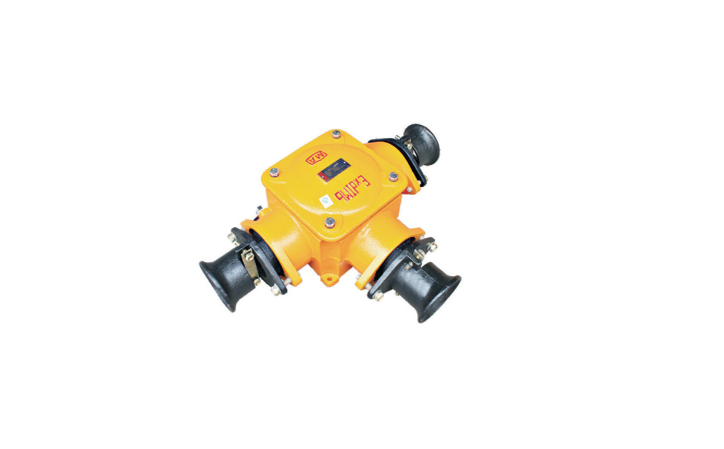 接線盒的隔爆外殼為鋼板結(jié)構(gòu),蓋采用螺栓壓接形式,兩側(cè)為電源引線端,并設(shè)有控制線引入裝置。殼體內(nèi)設(shè)有主接線端子,接線柱由壓板將電纜頭壓接。基座為低壓電瓷,并設(shè)有內(nèi)外接地端子。